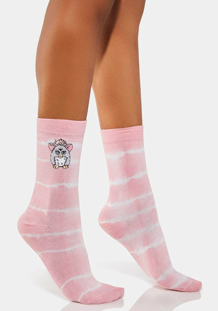 come in a crew sock length, with a tie dye print, and furby graphic on the ankle.