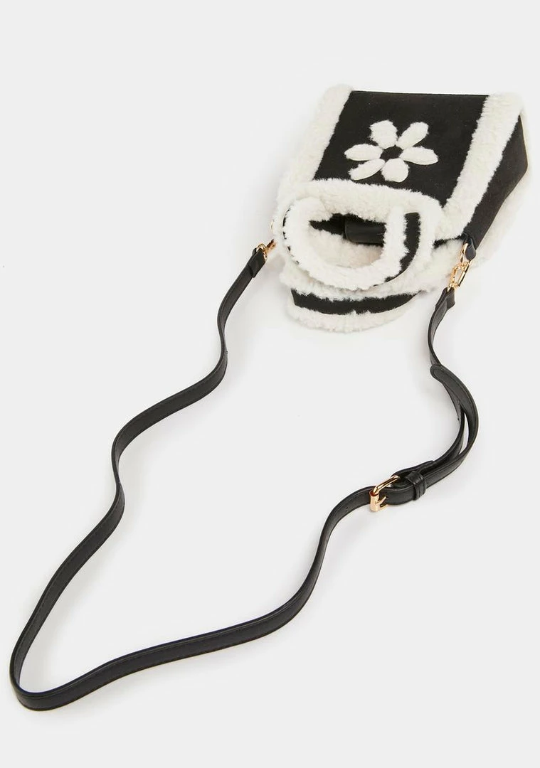 cuz accessorizing is the best part. This mini tote comes in a faux fur construction, with contrasting trim, top handles, a removable crossbody strap, and a flower detail at front.