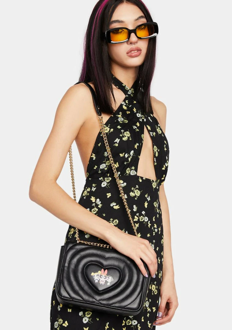cuz youΓ’ΒΒre made of sugar, spice, and everything nice. This vegan leather bag features an embroidered heart-shaped design at front with a Powerpuff Girls graphic, a gold-toned chain shoulder strap, and an internal zip pocket.