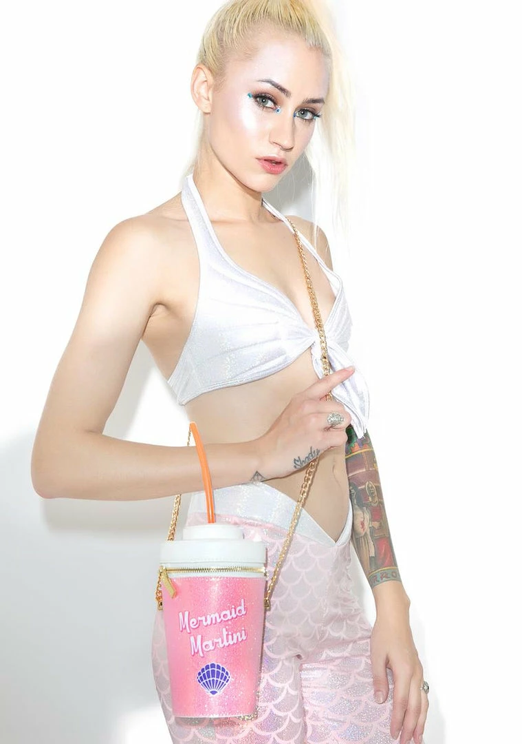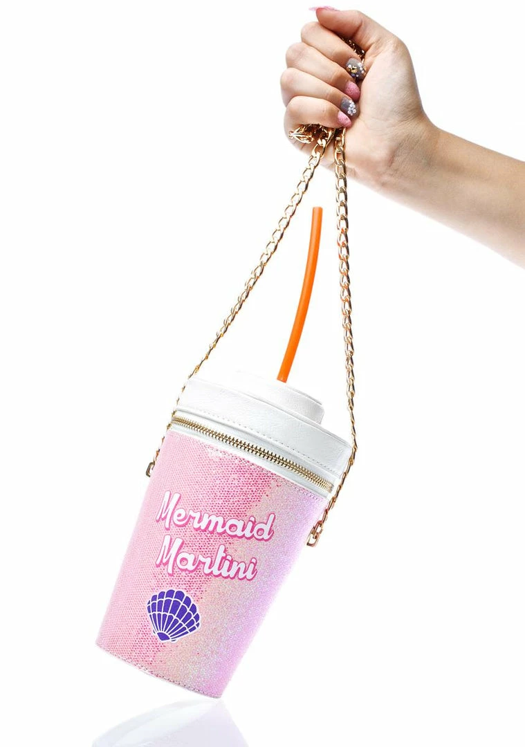 …letΓ’ΒΒs go steal sum money from sailors and buy ourselves a drink~! Get yer day-fade on in tha lagoon with this crazy cute cross body bag thatΓ’ΒΒs shaped like a to-go cup, featurinΓ’ΒΒ a hyper glittery baby pink textured construction, white vegan leather lid, a bright orange straw detail, full wraparound zip closure with gold hardware, seashell graphics and lettering that reads Γ’ΒΒMermaid Martini,Γ’ΒΒ and a sleek gold chain shoulder strap.
