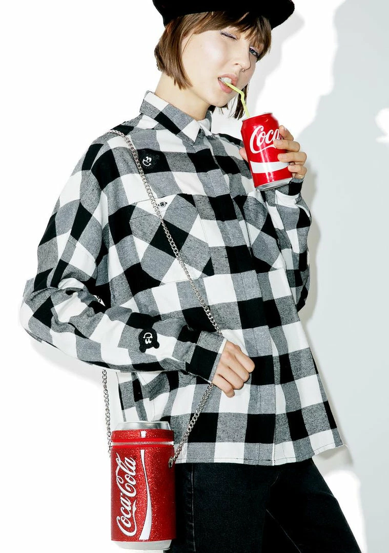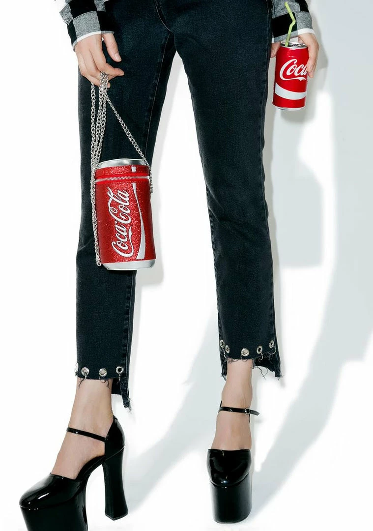 …I feel a jolt of energy suddenly! Grab a can Γ’ΒΒN take a swig from this sikk cross body bag, featurinΓ’ΒΒ a suuuper glittery red cylindrical construction resembling a classikk Coke can, shiny silver detailing, wraparound zip closure that opens up to a perfectly sized interior, chained silver shoulder strap, and Coke logo across the front.