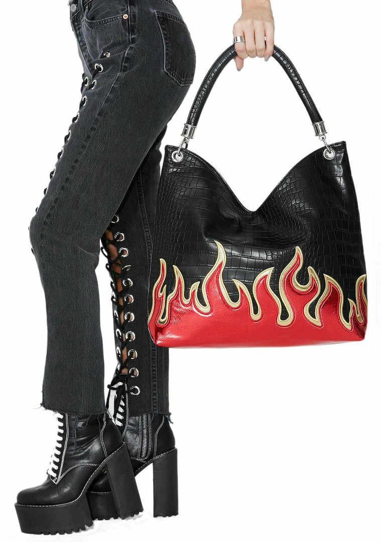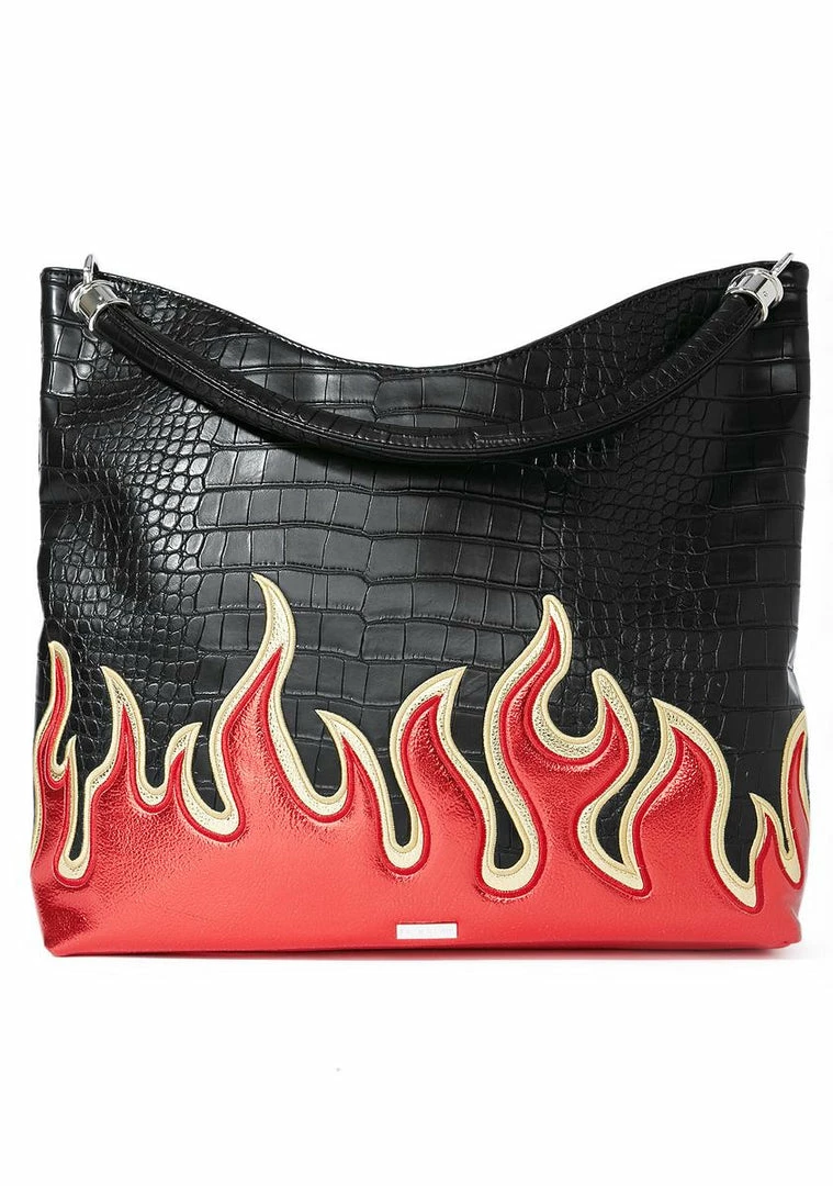 will turn it all to ashes~ Burn âem with this sikk shoulder bag, featurinâ a black vegan leather croc skin construction, slouchy, oversized interior, metallic flame appliques in red âN gold risinâ from the bottom, and a thick carrying strap.