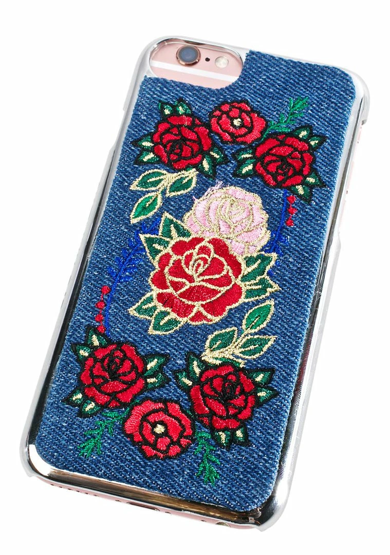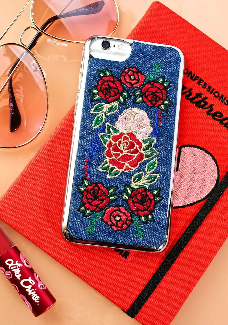 cuz yer phone wants some flower power too, babe. This cute lil phone case features a silver construction that snaps snugly to yer phone and has a denim back with a floral print.