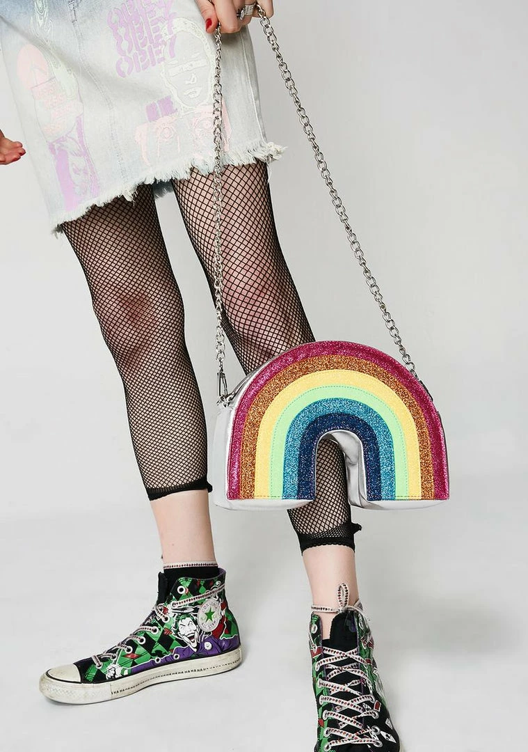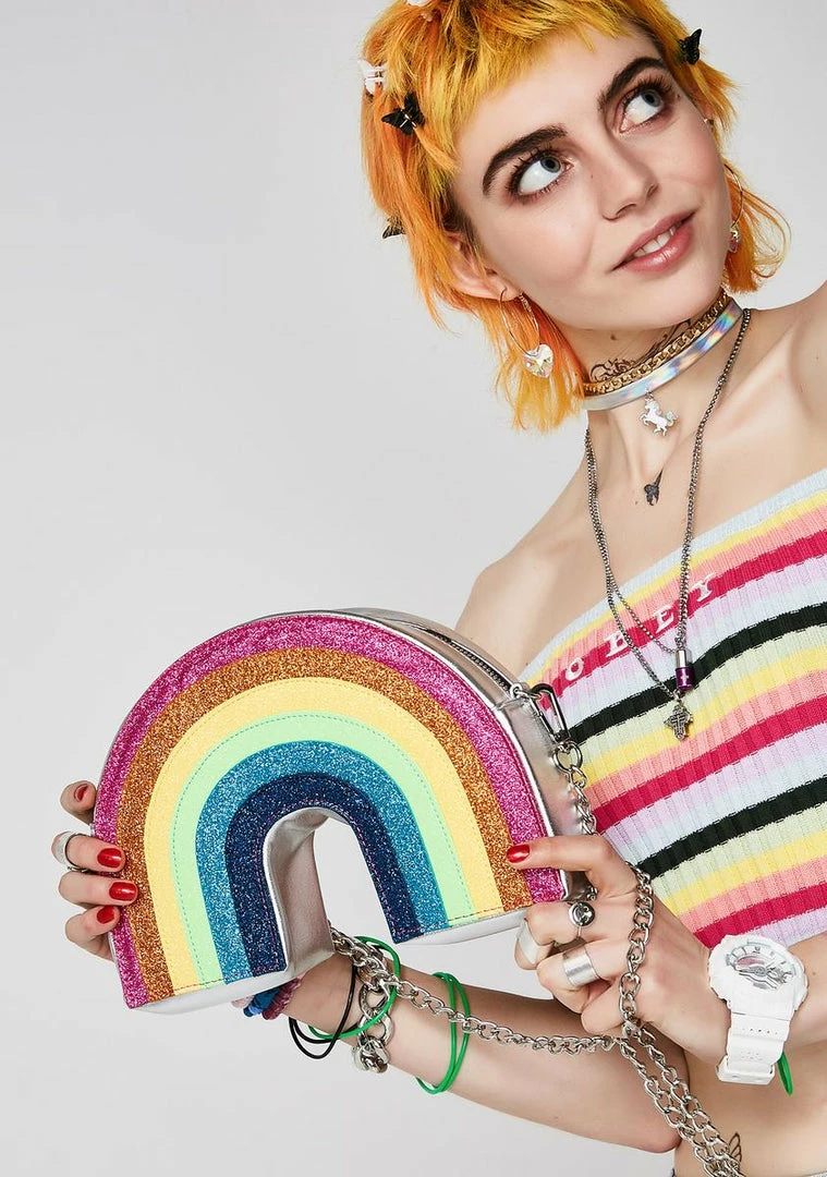 cuz you bring the sunshine. This cute af crossbody bag has a chain shoulder strap, a glittery rainbow on the front, and a top zipper closure.