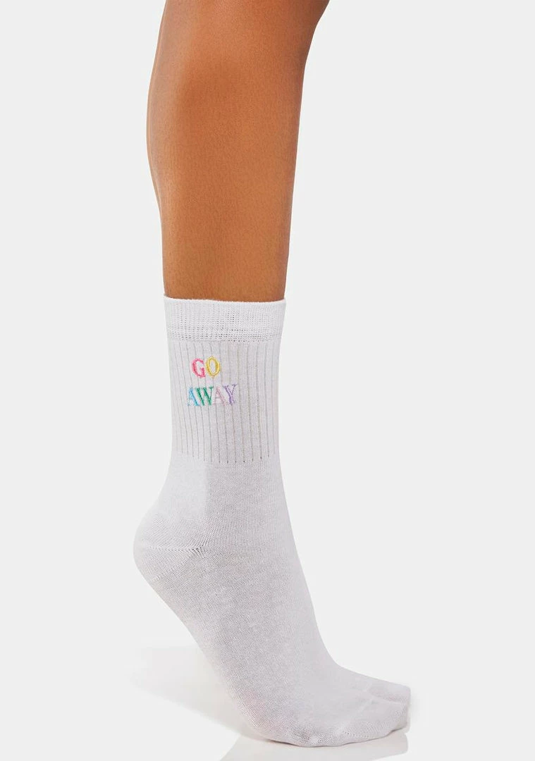come in a crew sock length, with ‘go away’ embroidered rainbow text on the ankle.