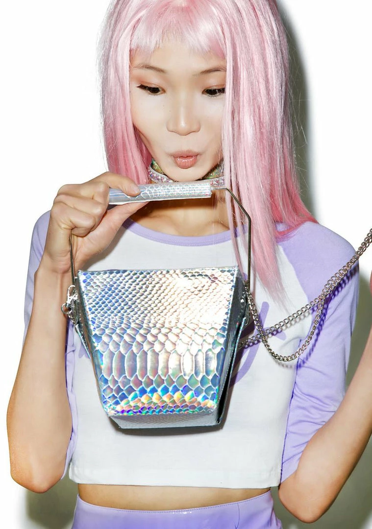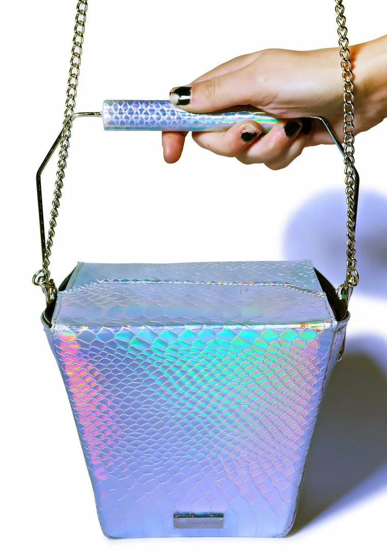 grab yer shyt, and take it to go gurl. This super cute bag is shaped just like a take out box, but this pretty Γ’ΒΒlil bb is made from an embossed hologram vegan leather complete with folding top closure. Featuring a removable chain strap and top carrying handle cuz we know ya love eating out.