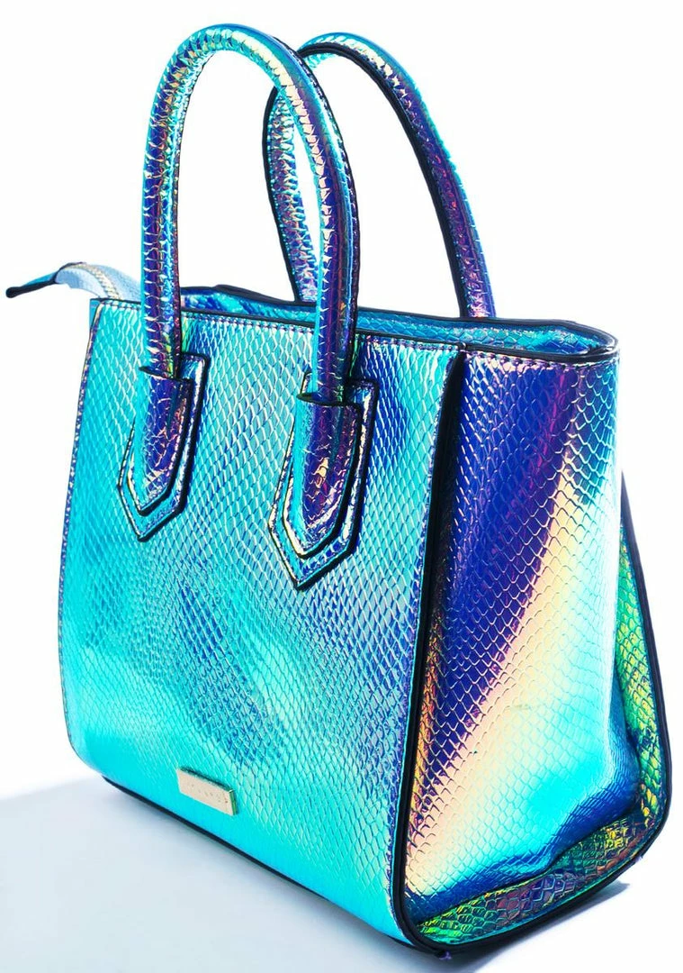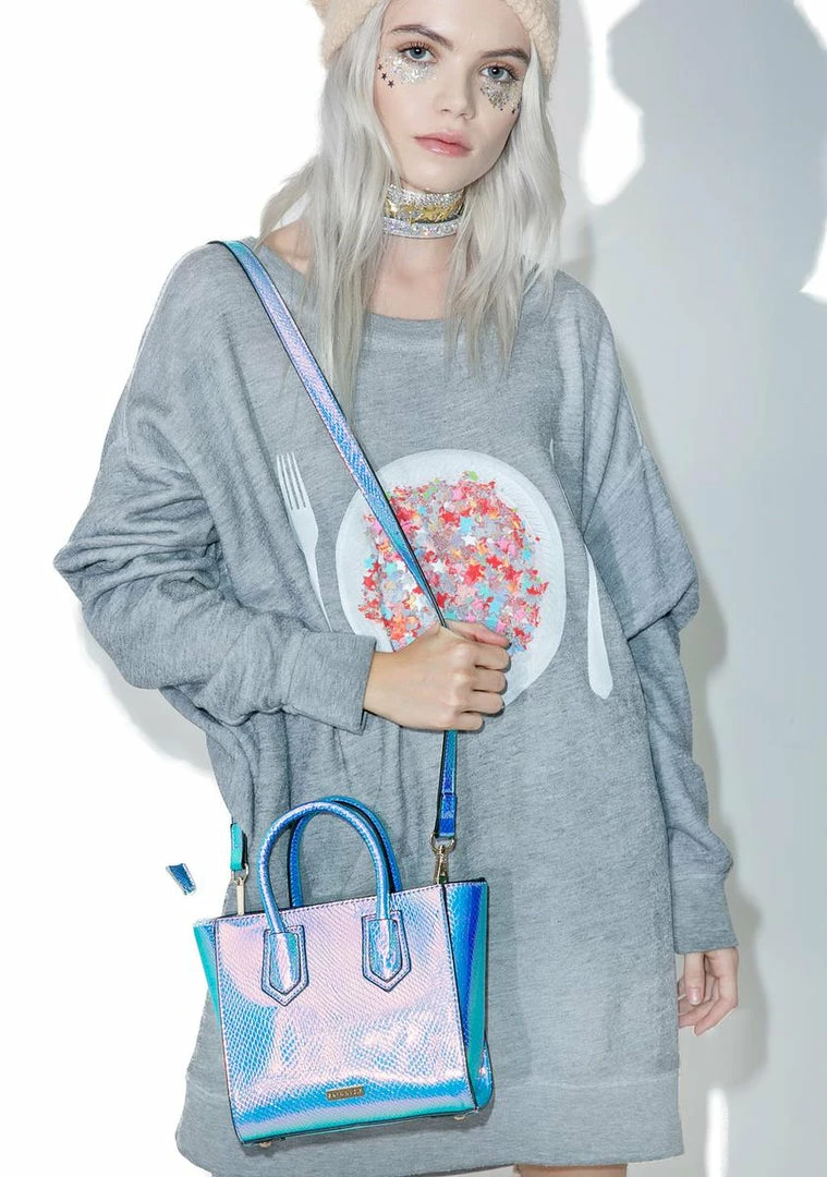 …have fun on your deep space exploration, bb! This super sweet mini tote will keep all yer necessities locked รขยยN secured in zero gravity, and features a crazy bright textured holographic construction that shines hues of pinks, purples, and blues, top zip closure, thick handles, and detachable shoulder strap.