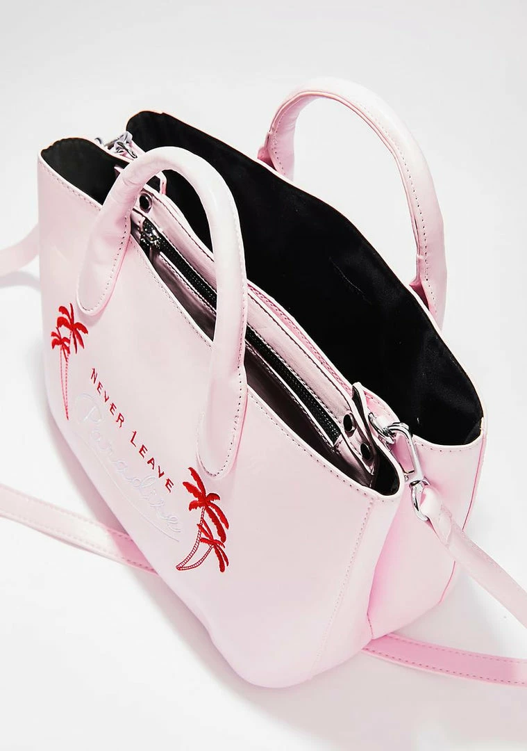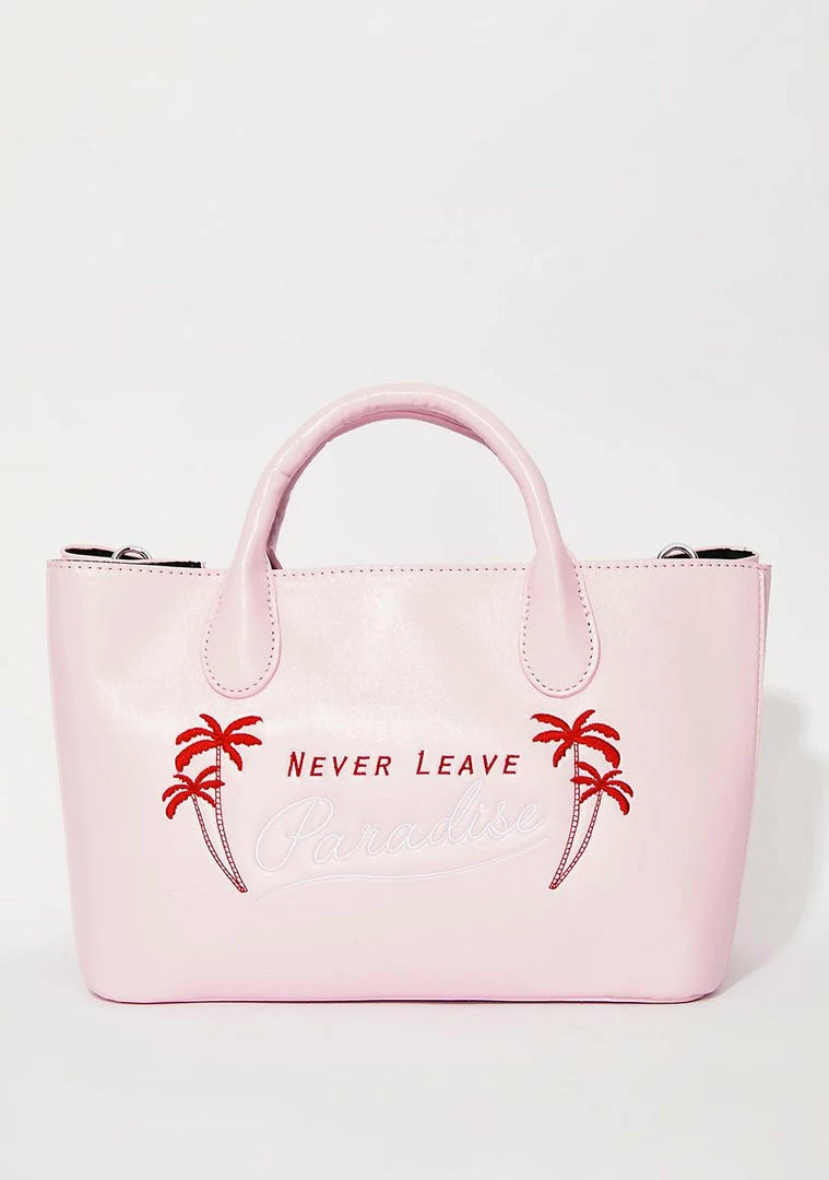 cuz youΓ’ΒΒre not goinΓ’ΒΒ back to reality. This light pink tote bag has two large compartments inside, a removable long shoulder strap, and embroidered text NΓ’ΒΒ palm trees on the front.