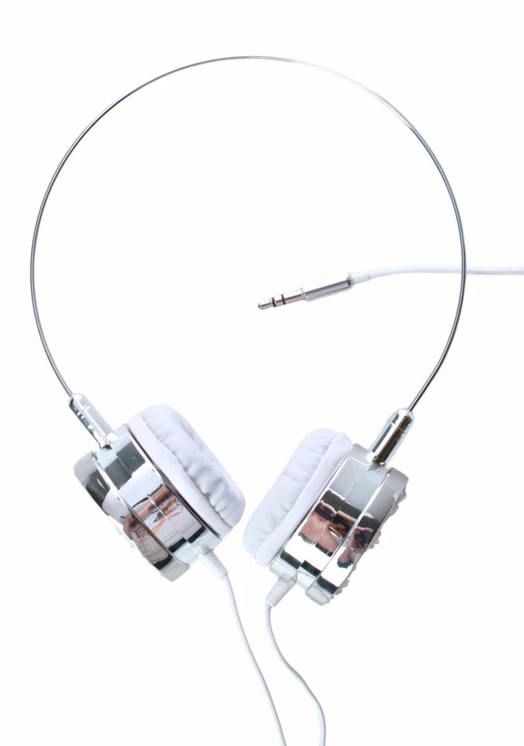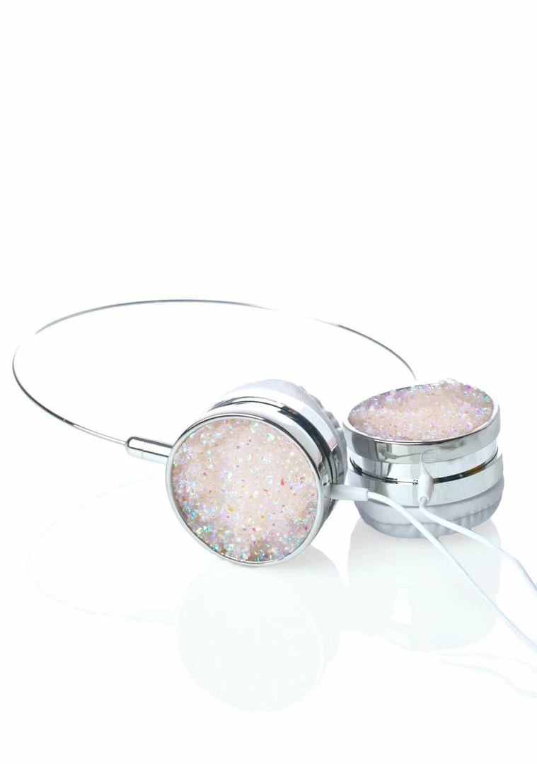 yer headphones will be as stylish as yew are, babe. These silver over-ear headphones feature a slim band, soft white ear pads, and pink crystal detailing.