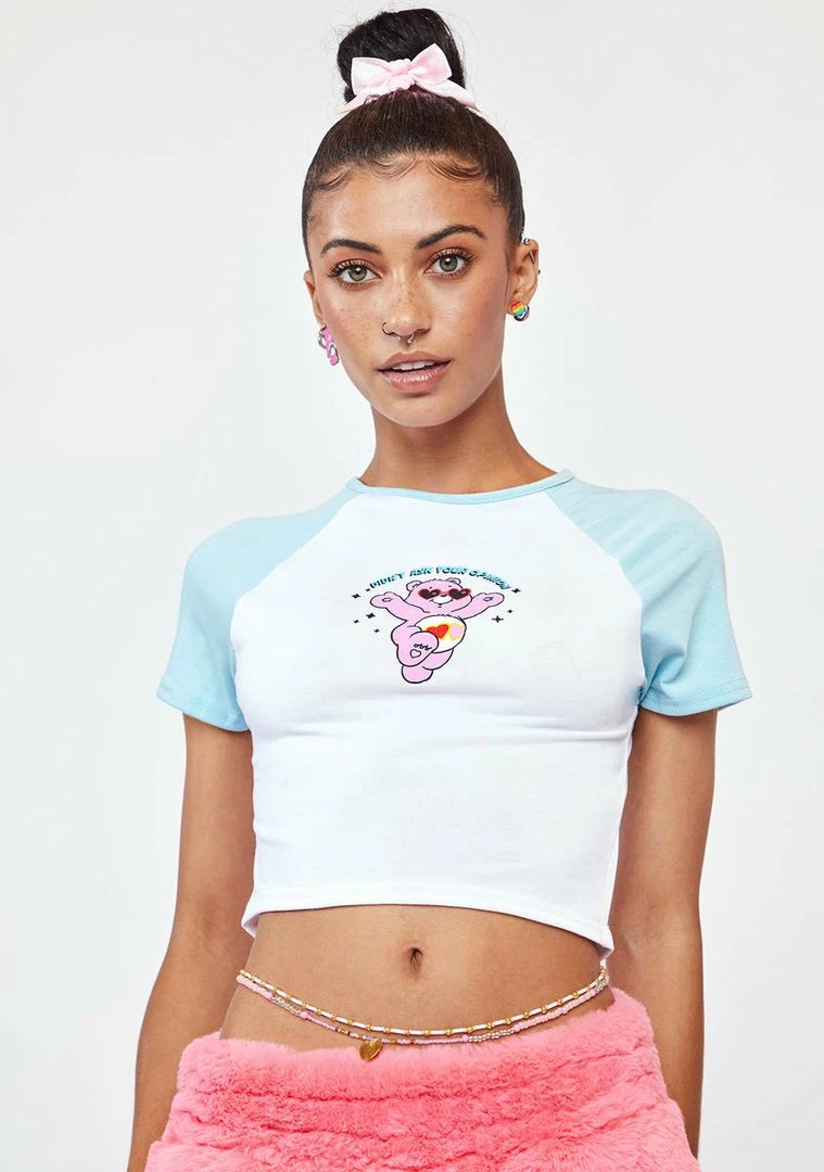 has a contrast blue collar and sleeves, a Care Bears graphic print on the chest, and a cropped hem.