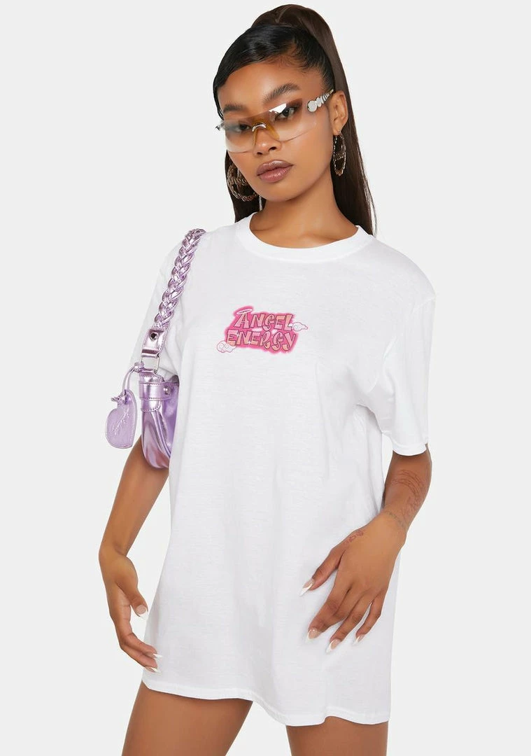 cuz you’re made of the right stuff. This oversized tee has “Angel Energy” printed at front and back, Bratz dolls graphics at back, short sleeves, and a crew neckline.