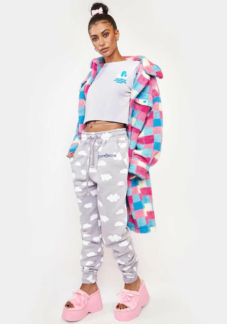 has an all over cloud print, a drawstring waistband, two side pockets, a graphic Care Bears logo on the thigh, and cuffed ankles.