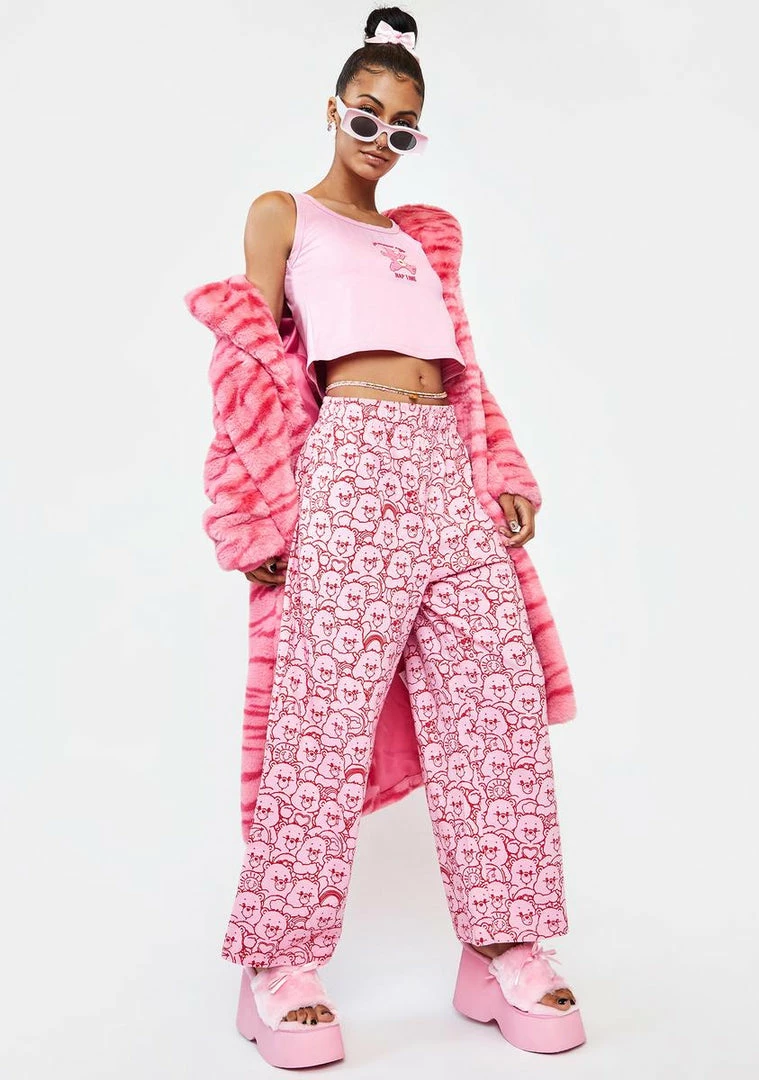 includes a crop tank with a Care Bears graphic on the chest and high waist bottoms with an elastic waistband and a repeating print all over.