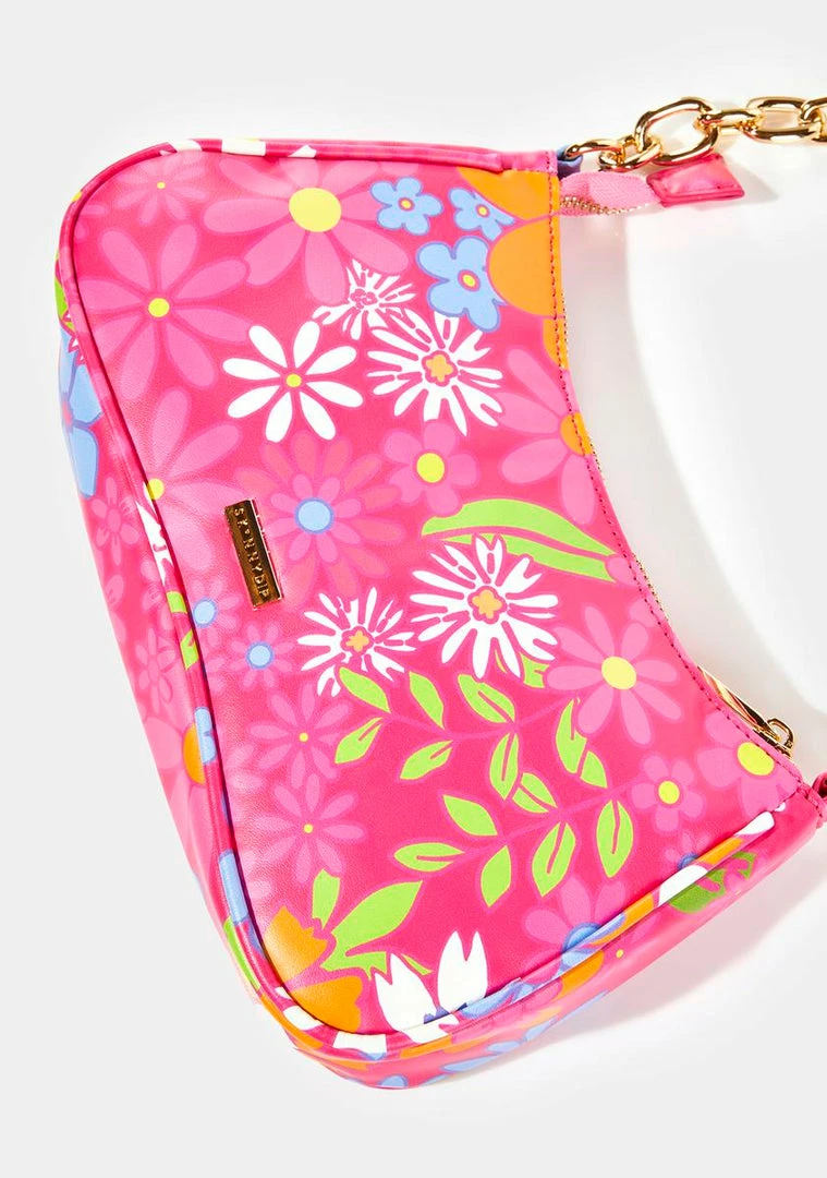 comes with a chain shoulder strap, a zip closure, and a retro floral print all over.